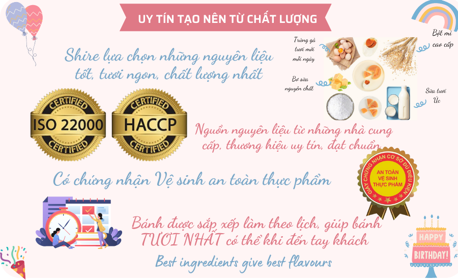 Shire là một trong những tiệm bánh Phan Thiết - Mũi Né uy tín, có giấy chứng nhận về vệ sinh an toàn thực phẩm. Đây là tiêu chí quan trọng để đánh giá tiệm bánh có bảo đảm an toàn chất lượng bánh kem làm ra.